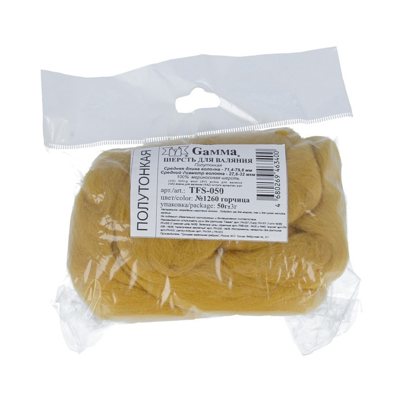 " Gamma" TFS- 050 " Шерсть для валяния" 100% полутонкая шерсть 50г №1260 горчица