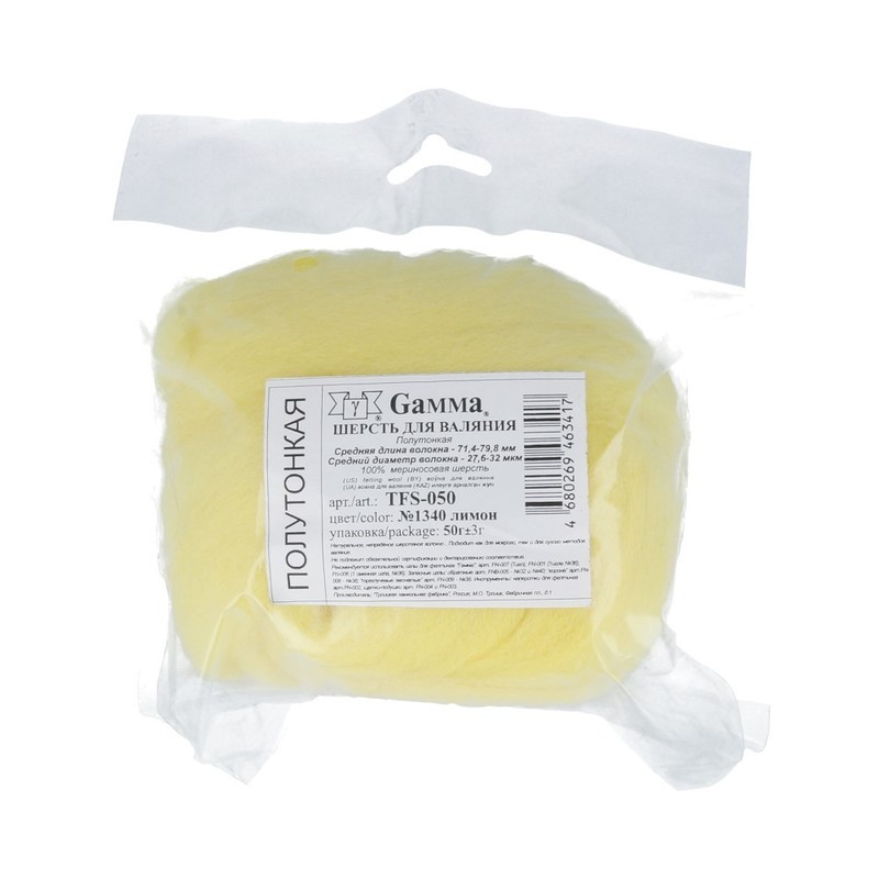 " Gamma" TFS- 050 " Шерсть для валяния" 100% полутонкая шерсть 50г №1340 лимон