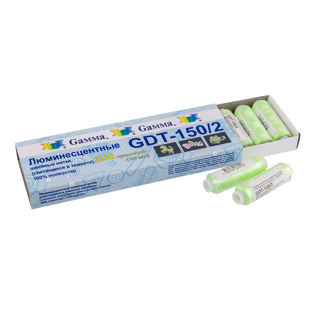 Нитки для вышивания " Gamma" Люминесцентные нитки ( светящиеся в темноте) GDT- 150/ 2 100% полиэстер 200 я 183 м №1 белый
