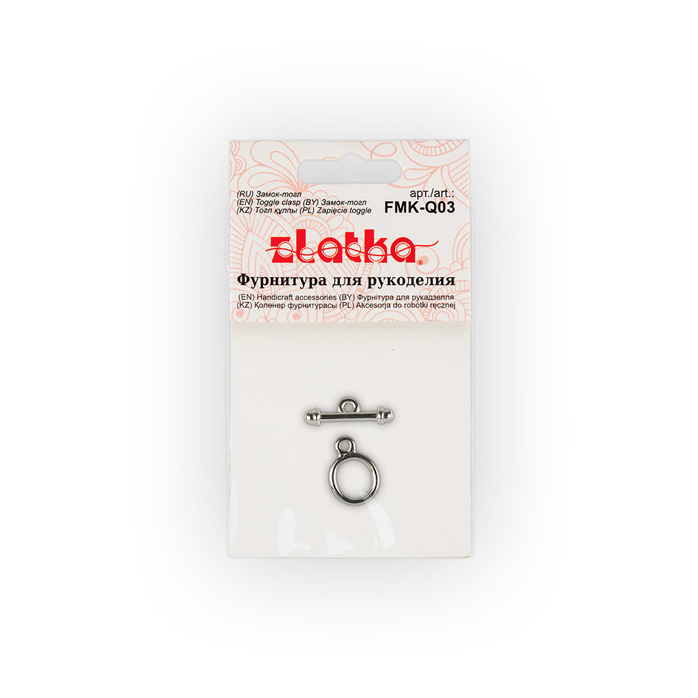 Замок- тогл " Zlatka" FMK- Q03 - это вид фурнитуры для бижутерии, используемой для застегивания браслетов, бус и колье. Он обладает простым и надежным механизмом крепления: т- образной палочкой и ответной частью, имеющей отверстие на несколько миллиметров меньше, чем длина палочки. Тогл не сможет раскрыться, пока палочка не будет повернута соответствующим образом. За счет силы тяжести, палочка тогла всегда находится перпендикулярно нитям, и обеспечивает прочное соединение. Такой необычный замочек может стать центральным элементом украшения. Размер: 9 х 12 мм - кольцо, 5 х 15 мм - Т- образная палочка. Использование качественной фурнитуры играет очень важную роль при изготовлении бижутерии. От правильного выбора подвески, коннектора, замка или любой другой связующей части зависит целостность готового изделия. Сообщить о неточности в описании